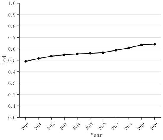 In Equation (10), k represents cities; i represents years; Lcd is the dependent variable; and Rd is the core explanatory variable. Pd, Pg, Ns, and Ruecr are control variables. a represents the regression coefficients of the respective variables; μk represents the fixed effects of provinces; and εki represents the random error term.