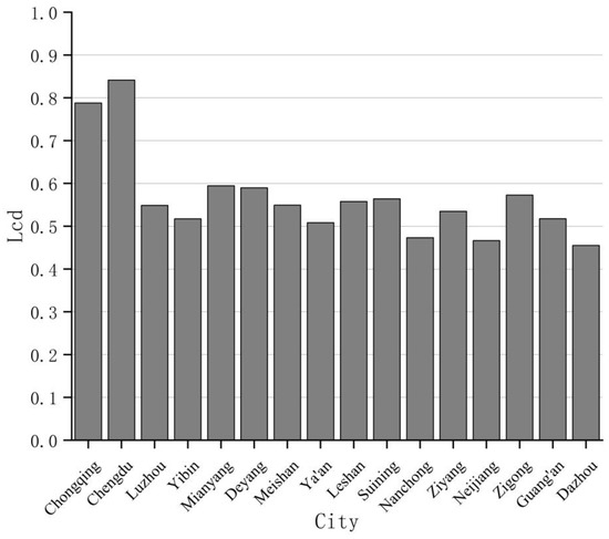 As shown in Figure 2, between 2010 and 2020, Chengdu and Chongqing led in their levels of coordinated economic and environmental development, with Chengdu surpassing Chongqing and both cities significantly outpacing others. Beyond Chengdu and Chongqing, the remaining cities exhibited coordination levels below 0.6, indicating a relatively lower overall level of coordinated development. This discrepancy may result from uneven resource distribution, insufficient policy support, and lagging infrastructure development in these cities, which, in turn, affects their compatibility with the industrial transfer from Chengdu and Chongqing. Moreover, these peripheral cities may also face environmental pressures and resource bottlenecks during their economic development, contributing to their lower levels of coordinated development compared to the “dual cores”.