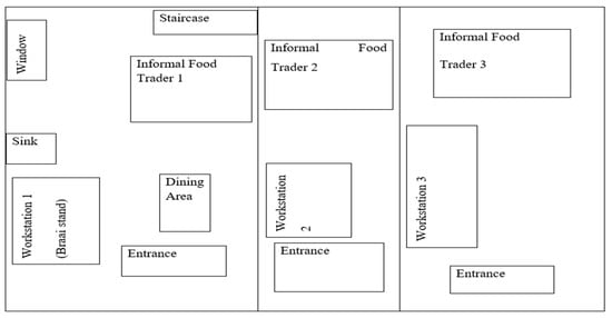 Fordsburg is known for housing the famous Fordsburg flea market. The flea market is situated in the central business district on the main route where there is huge traffic movement of motor vehicles. The flea market operates from Monday to Sunday, from 08:00 a.m. to 17:30, except on Indian religious holidays such as I’dul Fiter, during which the market does not operate. There are about 30 informal traders at the flea market involved in selling food, jewelry, toys, clothes, cosmetics, electronics, etc. Three of these traders are involved in food trading and they make use of charcoal as a source of energy for food preparation. Common foods that are prepared daily include chicken, chicken tikka, kebabs, rotis, Indian beef curry, samosas, etc. A schematic diagram, as shown in Figure 2, illustrates the layout of the flea market. The layout depicts a partially enclosed structure, with an opening facing the west side of the area on which there is high traffic movement of vehicles. Workstation 1, at which braaiing takes place, is only within a 1 m radius of the same place as the dining area at which customers sit whilst waiting for their food.