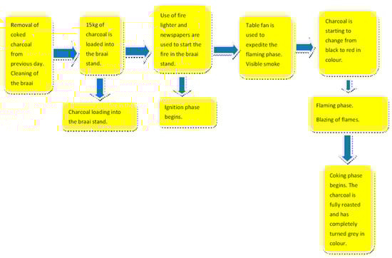 Different combustion phases require different periods to burn. Results showed that the coking phase lasts longer than the ignition phase and flaming phase. During the ignition phase, a fan was used to expedite the flaming phase by increasing air velocity and mixing charcoal to increase the blazing process whilst the charcoal started to burn. The duration of the coking phase was determined by the quantity of meat to be braaied, with the more meat to be braaied the longer the coking phase. Different phases within the combustion cycle require different meteorological conditions to complete a full combustion cycle. A flow diagram (Figure 3) below shows activities that were undertaken in the informal food outlet.