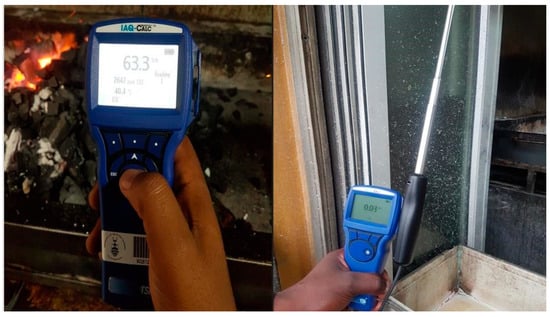 The VOC emissions during the different combustion phases of the food preparation were monitored using the photoionization detector (PID), MiniRae 3000 (RAE Systems, Inc., Kent, WA, USA) [14]. The PID, as shown in Figure 4, is a real-time direct-reading device with a 10.6 eV lamp (range 0.1–15,000 ppm) which was used to continuously detect VOCs.