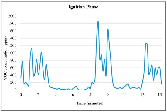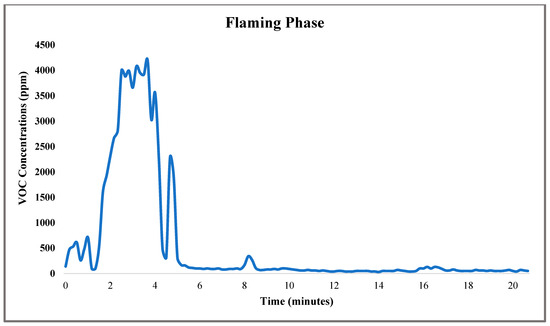 As combustion conditions improve, as in Figure 7, there is an observable reduction in the TVOC concentration. At this stage, there was a visible flame suggesting sufficient air and improved combustion conditions. In the first 5 min, there was a spike in TVOC emissions and then after the profile declined. At this stage, very little smoke was emitted, and the temperature started to increase. This phase had the highest emission of TVOC concentration levels out of all the combustion phases.