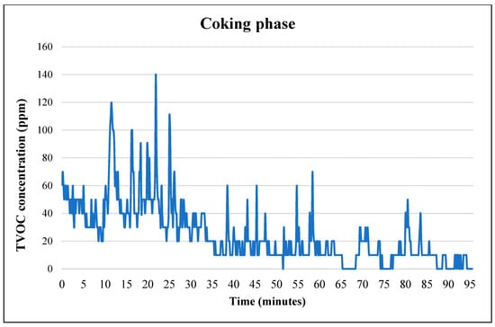 During the coking phase (Figure 8), char is burning in sufficient air and at a sufficient temperature. At this stage, there is no visible smoke or flame. The braaiing process starts immediately; the char burns under a homogeneous burning condition. This phase had the highest emission of TVOC concentration levels out of all the combustion phases. The coking phase was the longest in a single combustion cycle, with low TVOC concentration levels ranging between 0 and 140 ppm as compared to those in the first combustion phases. During this phase, the TVOC concentrations are 22.2- and 13.8-fold lower than those during the flaming and ignition phases.