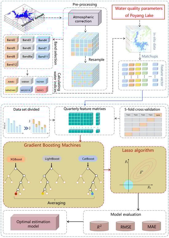 In this study, we developed a multi-model integrated learning method, named STE. This method uses an integrated learning framework, first introducing the Gradient Boosting Machine (GBM) to acquire input data and generate independent prediction results. Different machine learning models have different perceptual abilities and can extract different features from the data. Numerous studies have shown that averaging over ensemble members using multiple models can yield more accurate and reliable predictions than a single model []. Finally, the Lasso algorithm is introduced as a combination method to form ensemble predictions, thereby maximizing robustness and minimizing the possibility of overfitting. In this study, based on the characteristics of the data used, we chose three Boosting algorithms as the basic regression models, taking the B2, B3, B4, B5, B6, B7, B8, B8A, B11, and B12 bands of Sentinel-2 and five related indices as the input variables for the regression model. The related indices as input variables can fully mine the potential relationships among the data, further ensuring the accuracy of the model. The specifics are as follows.