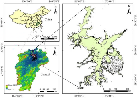 Poyang Lake (– N, – E) is located in the north of Jiangxi Province, spanning three cities of Jiujiang, Nanchang and Shangrao. It is the largest freshwater lake in China and the second largest lake in China, as shown in Figure 2. The Poyang Lake basin is an important grain production area and fishery base in China []. Poyang Lake is 173 km long from north to south, 74 km wide at its widest point from east to west, has a shoreline of 1200 km, and has a lake surface area of 3283 km2 when the lake mouth water level is 21.71 km. The lake water is mainly supplied by rivers such as Ganjiang, Fuhe, Xinjiang, Raohe, Xiuhe and Boyang River, Xihe, etc., and after regulation and storage, it flows northward into the Yangtze River from the lake mouth, with an annual average inflow of 146 billion cubic meters into the Yangtze River. The Poyang Lake water system basin covers an area of 162,200 km2, accounting for about 97% of the basin area of Jiangxi Province and 9% of the Yangtze River basin area. Poyang Lake plays an important role in regulating the water balance between the basin and the main stream of the Yangtze River, and in various ecological functions such as flood storage and maintaining biodiversity.