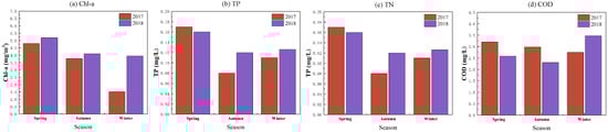 To observe the seasonal distribution of Chl-a, TP, TN, and COD in Poyang Lake, the model proposed in this paper is used to retrieve the concentration of each parameter in the water based on sampling points and Sentinel-2 images. The date of the Sentinel-2 images used is close to the date of in situ sampling point measurements. Figure 4 shows the average concentrations of Chl-a, TP, TN, and COD corresponding to the inversion results for each season from 2017 to 2018. As depicted in Figure 5, we have charted the seasonal distribution of various water quality parameters. As can be seen from the figure, the seasonal variation of Chl-a is the most significant, reaching its peak in spring, followed by autumn, and lowest in winter. This may be related to the increase in water temperature and light intensity in spring, which is conducive to the reproduction of algae such as cyanobacteria. The massive growth of cyanobacteria in summer also results in a higher concentration of Chl-a in autumn. Conversely, the TP concentration is at its maximum in spring and minimum in autumn and winter. This could be due to local temperature and precipitation changes, causing phosphorus elements from soil and vegetation to be swept into the water body with the springtime increase in temperature and rainfall. The TN concentration does not change significantly throughout the year, but it is slightly higher than other seasons in winter. The main reason may be that there is less rainfall in winter, while nitrogen elements from domestic pollutants around the watershed flow into the lake. The COD does not change much in spring and winter, and the concentration is high, while the concentration is low in autumn. The frequency and intensity of summer rainfall lead to an influx of nutrients like nitrogen and phosphorus into the reservoir, thereby causing a rise in the concentration of Chl-a.