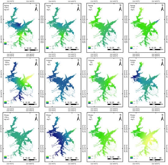 Mapping of the seasonal variation distributions of Chl-a, TP, TN and COD.