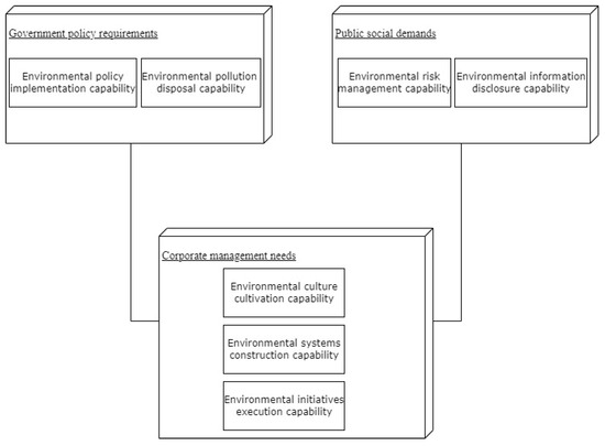 Traditional corporate environmental management aims at a single “pollution reduction”, focusing only on the final treatment and disposal of pollutants in production to meet emission standards. Under the new context of “double carbon” goals, corporate environmental management needs to be integrated into the entire process and all aspects of production and operations to balance “pollution reduction and carbon reduction” with value added. Therefore, it is necessary to reconstruct the corporate environmental management assessment system: As shown in Figure 3, the objectives of corporate environmental management are to respond to government policy requirements, corporate management needs, and public social demands. Among these, government policy requirements and public social demands provide external motivation for corporate environmental management, while corporate management needs represent the intrinsic motivation. These three objectives are interrelated and, together, contribute to the formation of the seven capabilities of enterprise environmental management.