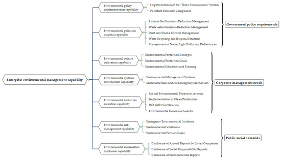 Environmental management includes the management of the environment itself and the management of development in consideration of the environment [1]. At the enterprise level, environmental management is the management implemented to control the environmental pollution caused by production and operation activities [2], which includes not only the management of pollutant emissions that have a direct impact on the environment, such as waste gas and wastewater disposal, but also the guidance and management of the long-term development of the enterprise with the aim of reducing environmental impact, for instance, the environmental institutional arrangements, and even the construction of the enterprise’s environmental culture.