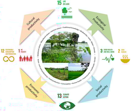 Figure 1. A conceptual diagram illustrates the dimensions of sustainability and productivity within VTCSs, aligning with the pertinent United Nations Sustainable Development Goals (UN-SDGs) of the 2030 Agenda for Sustainable Development. To achieve sustainability in VTCSs, it is necessary to uphold optimal levels across the ecological, cultural, social, and economic productivity dimensions. Source: inspired by Dubey et al. [21], McNeill [34]. Image: water and agricultural ecosystems of a VTCS; photo credit: Sujith S. Ratnayake.