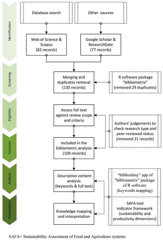 The first step in this process involved the development of 16 key themes and potential keywords related to sustainability and productivity dimensions based on the SAFA tool version 2.2.40 [58,59] (Figure 3). This was followed by a determination of the degree of inclusion of 16 themes in the 109 research studies, obtained by analysing author keywords and full texts (Table S1). The total number of research studies that fell under each theme was then calculated for analysis and to map the research knowledge.
