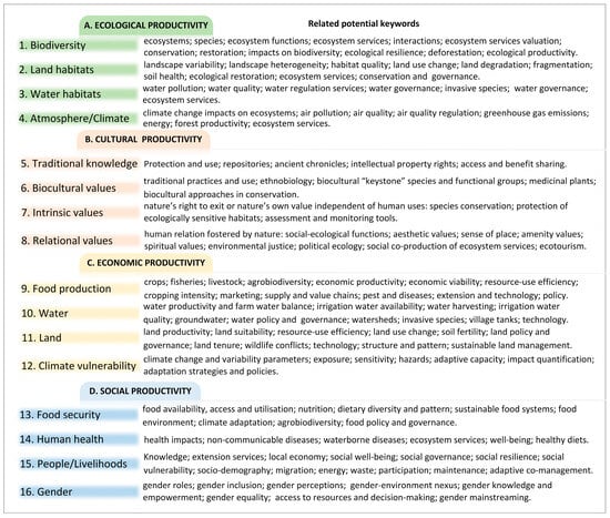 Figure 3. Sustainability and productivity dimensions, themes, and related keywords, assessed using SAFA tool. Source: adapted from the SAFA tool of FAO [58,59]. The dimensions of ecological, cultural, economic, and social productivity can be associated with enhancing either the sustainability or productivity of VTCSs. This association depends on their role in either sustaining resource systems to enhance ecological and cultural productivity or in utilising resources to boost the economic and social productivity of VTCSs.