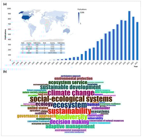 Figure 4. Global trends in the scientific production of publications in the field of SESs between 1992 and 2023: (a) annual and nation-specific production; (b) word-cloud map of the 50 most frequently used keywords by authors in the global studies. The maps were generated through the biblioshiny web interface of the bibliometrix package using the R programming language.