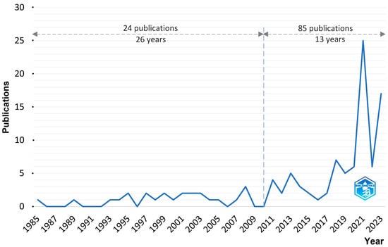 Figure 5. The trend in the annual production of VTCS research publications in Sri Lanka between 1985 and 2023.
