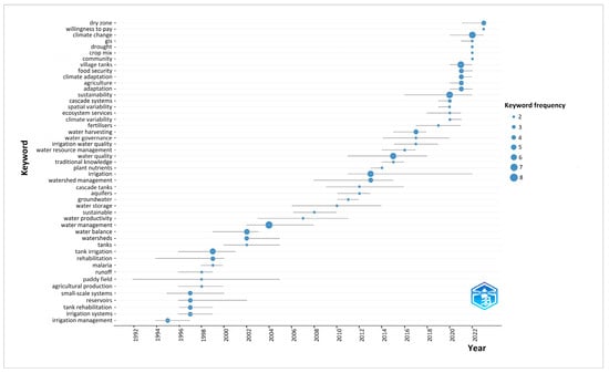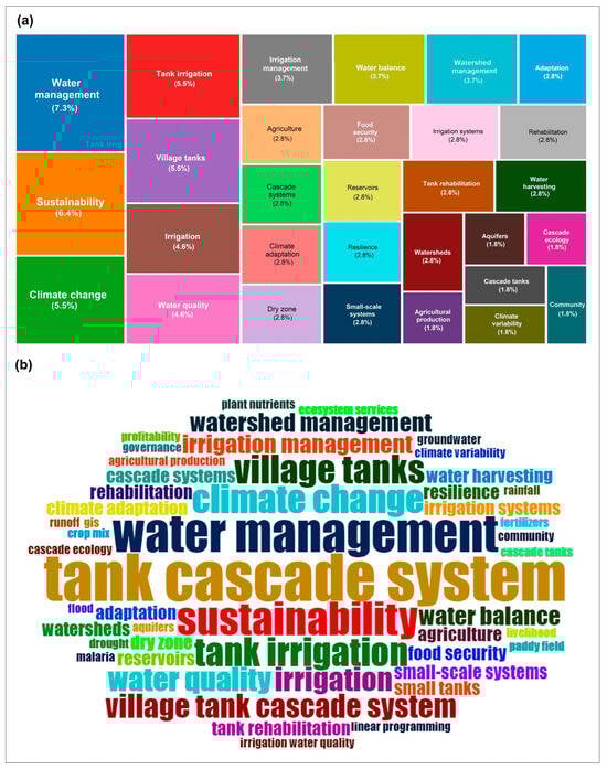 Figure 6a presents a word TreeMap of the top 30 keywords in VTCS research. Figure 6b presents a word cloud map of the top 50 keywords. The top 10 keywords accounted for 56% of the cumulative frequency of keywords in the top 30 keywords (Figure 6a). Of the top 10 keywords, 21% related to water management (“water management”) and irrigation management (“tank irrigation”, “irrigation”, and “irrigation management”). Similar to the global pattern in SES research, the terms “climate change” and “sustainability” were also among the top 10 keywords in VTCS research.