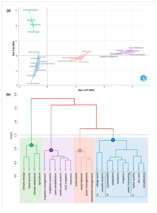 The factorial analysis of peer-reviewed published data of VTCS research recognised four dominating clusters or subfields in the VTCS research domain. Four clusters are displayed in Figure 8: cluster 1 (green), cluster 2 (purple), cluster 3 (red), and cluster 4 (blue). The two conceptual structure maps—the words map (Figure 8a) and tree dendrogram map (Figure 8b)—offer an in-depth perspective of the interrelationships among various research themes. These maps categorise VTCS research into clusters focusing on different topics: climate change and food security (cluster 1); irrigation water supply and management (cluster 2); agricultural water demand and supply (cluster 3); and the spatial characterisation and sustainability performance of landscapes (cluster 4). These clusters illustrate the diverse research directions within VTCS studies.