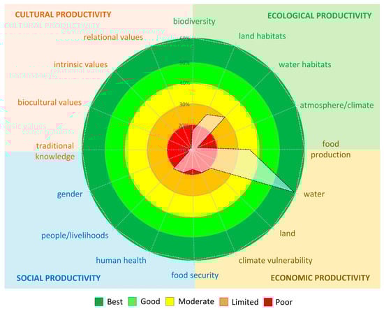 The radar map presented in Figure 9 serves as a visual summary of how aspects of the sustainability and productivity dimensions (ecological, cultural, social, and economic productivity) have been incorporated into VTCS research. This analysis is based on a review of 109 research publications, which identified 16 thematic areas reflecting the dimensions of sustainability and productivity. The extent to which these themes are represented in VTCS research was categorised into five levels: Best; Good; Moderate; Limited; Poor. A comprehensive classification of the 109 studies is detailed in Table S1. From the map, it is evident that themes related to economic productivity, especially those concerning water and food production, have received considerable attention in VTCS research, scoring highly on the map. In contrast, themes related to cultural productivity, such as traditional knowledge and biocultural values, are underrepresented. Meanwhile, themes pertaining to social and ecological productivity were given slightly more emphasis in previous VTCS studies.