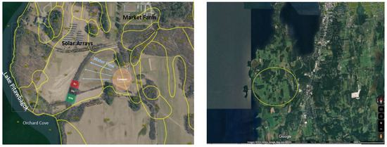 Study site at Shelburne Farms and Orchard Cove. Image on the right shows an overview of the surrounding area in Shelburne, VT, with the yellow circle highlighting the farm and outflow into Orchard Cove. Image on left shows a detailed image of the farm features and study site on the drainage way amidst the riparian forested buffer (Google Maps, aerial view, accessed 8 March 2024).