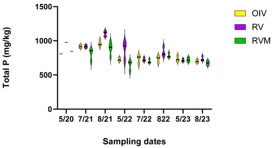 The GLM indicated differences among treatments and times (p < 0.001). Post hoc Tukey analysis revealed lower TP in the fourth year than in the first year of the study (p < 0.01) (Figure 2). The mean TP concentration in the soil diminished from 876 mg/kg in 5/2020 to 724 mg/kg in 5/2023, which is a 17.5% decrease when looking at the combined means of the restored plots. There were also differences among the treatment plots. The TP concentrations followed this order: RVM < OIV < RV. This may indicate that mycorrhizae were helping to mitigate P. However, the decrease over time was not uniform across the plots. The greatest change was between May 2020 and May 2023 in RV, which decreased by 36.58%, whereas RVM and OIV only decreased by 16.70%, and 9.88%, respectively. Our hypothesis that RVM would have the largest decrease in TP was not proven true for the four years that we monitored the plots since the restoration.