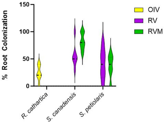 Root colonization (percent of root) for R. cathartica, S. canadensis, and S. petiolaris in the three treatment plots in 2023.