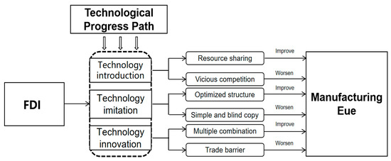 To begin with, FDI can elevate manufacturing EUE by leveraging technology imitation. Foreign direct investment is conducive to improving the technological imitation rate, accelerating technological progress, and overcoming technological trade barriers (Shen and Yin, 2009 [25]). Technological imitation can realize technological innovation more directly, and foreign investors have shown high productivity in both production and management technology. The imitation and creation of technology brought by foreign direct investment is the competitive advantage of manufacturing industries. Enterprises in various industries will continuously optimize their industrial structure in the competition, reduce the profit margin, and invest capital in technology research and development. Technological innovation enhances the likelihood of green competition, thereby boosting manufacturing performance.
