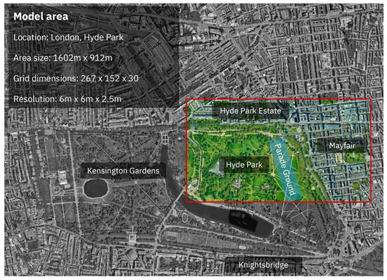 To reduce simulation time while keeping a reasonably high resolution, the model area for the investigation only covers the northeastern part of Hyde Park (Figure 1). Additionally, it includes parts of the city districts Mayfair and Hyde Park Estate in order to analyze both the microclimatic conditions within the park and the surrounding built-up areas. Furthermore, it allows the investigation of possible park cooling effects on surrounding areas. The model area’s extent equals 1602 × 912 m with a grid resolution of 6 × 6 × 2.5 m.