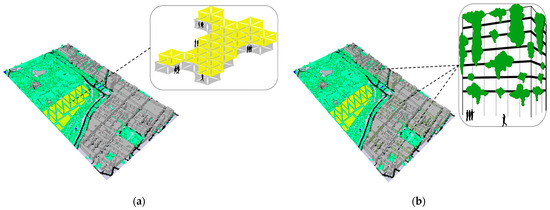 Figure 2. Model area configurations with the application of heat mitigation measures using temporary sun sails (a) and façade greenery in addition (b). - In order to directly address the heat issues in the built-up areas surrounding Hyde Park, the third scenario proposes the implementation of façade greening as an in-situ measure (Figure 2b). Façade greening is effective in reducing high temperatures both inside and outside buildings by means of transpiration and interception of solar radiation. Consequently, it helps to maintain a comfortable indoor temperature during the summertime while also providing thermal insulation during colder periods [55,56]. Furthermore, the advantages of façade greening extend beyond their climatic benefits: they include aesthetic improvement, enhanced air quality, noise reduction, and they provide habitats for insects and small wildlife. On the contrary, there are also several disadvantages, for example, regarding maintenance effort, water consumption due to irrigation, and high costs [57]. While roof greening applications are more complicated due to the need for substrate and irrigation, façade greening can be applied more easily, e.g., using soil-bound ivy. In this hypothetical scenario, urban planning directives yield a strong greening of the urban quarter, for example, by implementing tax incentives or subsidies, leading to our presented approach, where 50% of all buildings were greened based on a random selection. To avoid application issues with the impervious soils near buildings, i.e., pavements and streets, we assume the greening to represent greenery-substrate-modules, which are attached to the wall. They cause less damage for underlying wall materials than directly grown ivy. However, they would need an automatic irrigation system, which likely has a high maintenance effort to be covered by urban planning services. In ENVI-met, these items were defined by the default database ID 02AGSS, containing a simple plant with a height of 30 cm and an LAI of 1.5 m²/m², as well as an automatically irrigated substrate consisting of sandy loam and Styrofoam layers [58,59].
