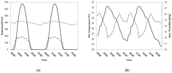 Full forcing boundary conditions used for all scenarios depicting direct shortwave (black line), diffuse shortwave (dashed line), and longwave radiation (dotted line) (a) as well as potential air temperature (black line) and specific air humidity (dashed line) (b).