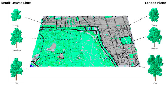 To assess the health of the park’s trees, physiological data from two prevalent tree species in Hyde Park were analyzed and compared between status quo and the irrigated Scenario 1. To compare the variations between different development stages within a tree species, representatives from three distinct age groups—young, medium-aged, and old trees—were observed in each case. Physiologically, they mainly differ in height, width, and root diameter, as well as leaf area density (LAD) and distribution in ENVI-met [75]. One of the tree species represents the London plane, which is the most abundant tree species, comprising approximately 40% of all trees in Hyde Park [76]. The other species is the small-leaved lime, which covers around 4% of the total trees [76]. Both are characterized to be rather resistant against hot and dry conditions, while the London plane typically comprises a higher LAD [77,78]. The observed trees’ locations within the model domain are displayed in Figure 4.