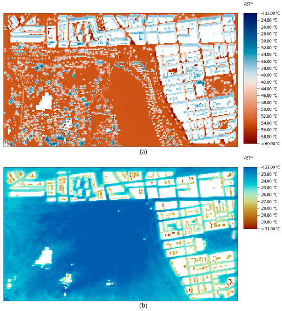 PET result maps at 1 p.m. (a) and 10 p.m. (b) at a cut height level of 1.25 m. PET* is the default name for PET in ENVI-met as the model implemented the corrected PET calculations with V5.5.
