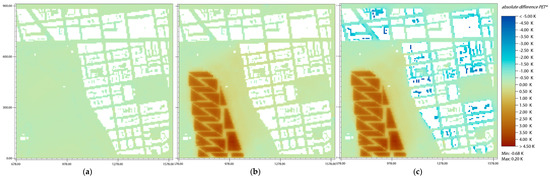 Daytime PET comparison maps at 1 p.m. at a cut height level of 1.25 m, showing differences between status quo and the scenarios using irrigation only (a), additional sun sails (b), and additional façade greenery (c). PET* is the default name for PET in ENVI-met as the model implemented the corrected PET calculations with V5.5.
