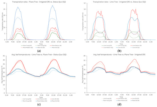 Tree health plots presenting transpiration rates in status quo and irrigated scenarios in different development stages of plane trees (a) as well as lime trees (b), and average leaf temperatures of plane and lime trees in the status quo scenario (c) as well as in the irrigated scenario (d).