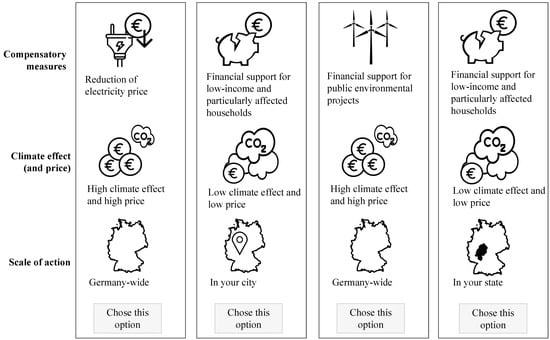 The scale of action attribute represents the personally visible beneficial actions for the individual citizen on different regional levels. We examine how the perception of these actions influences acceptance. To our knowledge, examining the field of action is a so-far ignored attribute, but as has been discussed before, political trust is an important factor in CO2 pricing acceptance [31,32,33], and in Germany, political trust is higher in local municipalities than in national government [56]. Furthermore, German citizens, being more individualistic than collectivistic [57], support revenue recycling schemes that benefit themselves individually [58,59]. Therefore, we hypothesize that the more locally the reinvestment effects are seen and the more the individual personally benefits from it, the higher the acceptance. To operationalize this attribute in the survey, we differentiated between visible benefits throughout Germany in the state of the participant or in the city he/she is living in.