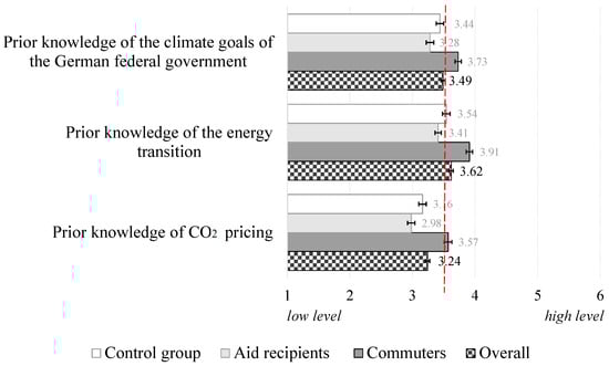 When asked about their self-assessed prior knowledge regarding CO2 pricing, energy transition, and the climate goals of the government, participants indicated their knowledge to be in the middle range. However, the three study groups differed significantly in their means (F(2,1206) = 18.1, p ≤ 0.001, η2 = 0.03), with the group of commuters reaching higher values than social welfare recipients and the control group. Figure 3 shows the resulting means for the three categories of prior knowledge, both group-specifically and for the whole sample.