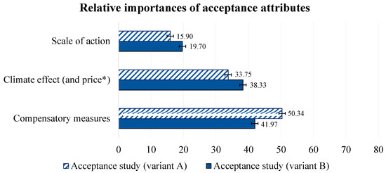 Relative importance of CO2 pricing acceptance attributes (N = 1209; * refers to variant B of the questionnaire, i.e., climate effect with consideration of price; error bars refer to standard errors).