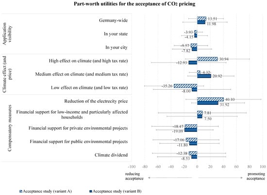 The configuration with the highest choice decision in variant A of the acceptance studies (=best case) contains the following characteristics: the reduction of the electricity price (+40.1; SD = 57.4), high climate effect (+30.9; SD = 48.9), and a Germany-wide scale of action of the effects of CO2 pricing (+13.5; SD = 26.5). The configuration with the lowest choice decision (=worst case) includes, in this variant, the following characteristics: financial support of private investments for climate protection (−18.5; SD = 50.8), low climate effect (−35.3; SD = 45.3), and perceptibility within the participant’s own city (−9.6; SD = 25.7).