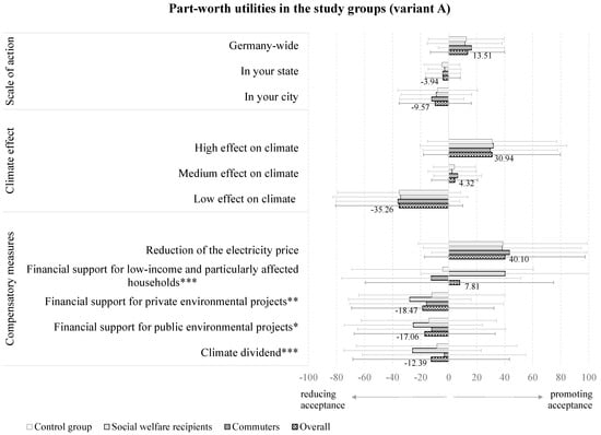 In variant B of the studies, assessments of the three groups differed significantly on the individual levels of all three attributes (Figure 7). As to the compensatory measures, social welfare recipients voted significantly more strongly for financial support of low-income households (+23.62; SD = 52.8) and against private environmental projects (−26.50; SD = 42) in comparison to the commuters (household: +1.86, SD = 53.7; private projects: −20.56, SD = 40.9) and the control group (household: −2.81, SD = 48.9; private projects: −10.33, SD = 46.9). Regarding the climate effect with price considerations in the acceptance decision, we found small differences in voting for low climate effect accompanied by low prices. Here, the control group (−16.59; SD = 58.7) voted significantly more negatively to such a solution than the other study groups (commuters: −5.79, SD = 63.4 and social welfare recipients: −1.48; SD = 55.3). Considering the scale of action as the attribute for the acceptance of CO2 pricing, small significant differences emerged for the perceptibility of the measures in the state, where social welfare recipients (−6.84; SD = 18.4) voted slightly more negatively against it than commuters (−3.70; SD = 18.5) and respondents in the control group (−1.96; SD = 21.2).
