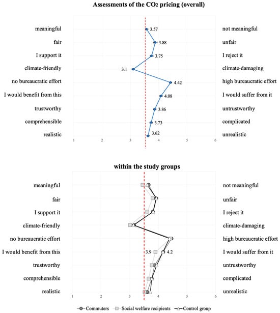Polarity profile of assessments of CO2 pricing in both acceptance studies; top: overall (N = 1209), bottom: for the three study groups (commuters n = 401, social welfare recipients n = 401, control group n = 407).