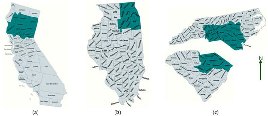 The counties used for the analysis in each state are marked. Adapted from US county maps, 2023; (a) California; (b) Illinois; (c) North and South Carolina.