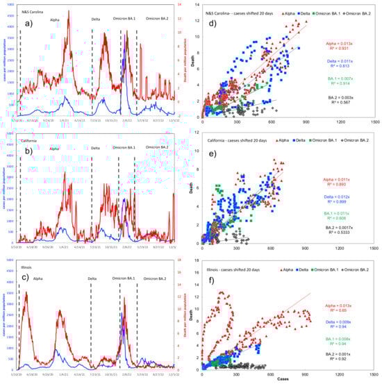 Figure 2a–c illustrates the 7-day moving average of daily COVID-19 case numbers and deaths per million of the population in the states of California, North and South (N&S) Carolina, and Illinois (see Section 2.3). The four COVID-19 variants Alpha, Delta, and the Omicron subvariants BA.1 and BA.2 were distinguished by maxima during their respective dominancy periods. Despite differences in the number of daily cases and death numbers, all three regions have similar temporal variability with maximal death numbers typically shifted about 20 days compared to those of cases. This is due to several factors such as the treatment time, average ages of patients, vaccination rates, treatment availabilities, etc. (e.g., [32]). The correlation between the reported number of cases and deaths shows linear relationships for all variants (see Figure 2d–f). The case fatality ratio, given by the slope of the correlation between the number of deaths and the number of cases (Figure 2d–f), was highest during the Alpha and Delta variants for all regions ranging from ~1 to 1.3%, with Alpha being deadlier than Delta in Illinois compared to California and North and South Carolina (Figure 2). The Omicron variant BA.1 was much deadlier than BA.2, which had the smallest death rate. In California, variant BA.1 had almost the same case fatality ratio as the Alpha and Delta variants of about 1.1%. The low case fatality ratio of BA.2 variant might be explained by the improved treatment, recovery rates, and safety measures during the BA.2-dominant period [13,33]. These case fatality ratios of about 1% are consistent with earlier reports of case fatality ratios in the US (e.g., [34,35]). A list of all the correlation parameters is shown in Table S4.