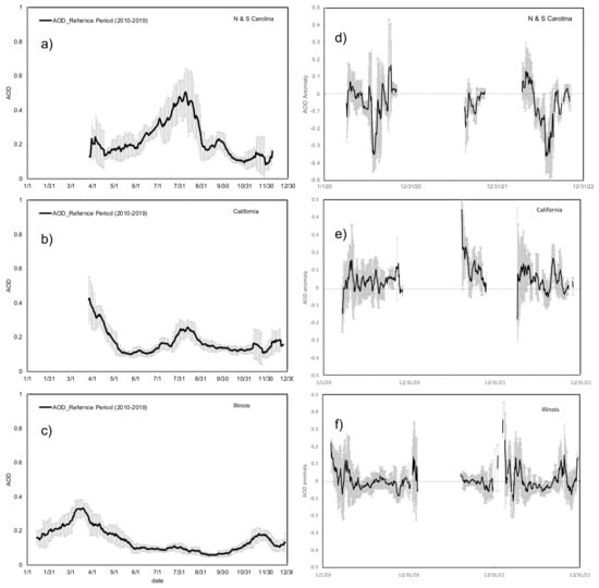The 14-day moving average of AOD for the reference period of 2010–2019 (a–c), and the calculated anomaly for the years 2020–2022 in North and South Carolina, California, and Illinois (d–f).