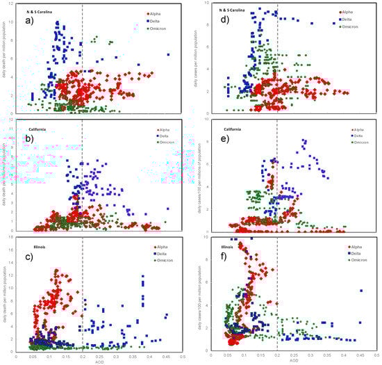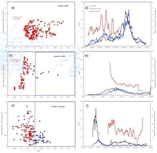 The correlation between the mortality rate and AOD shows that the split between AOD > 0.2 and AOD < 0.2 in North and South Carolina is not apparent in the Alpha variant as in the Delta variant (Figure 5), still with a positive correlation and a slope of 10.5 ± 0.3. The Delta variant shows a much higher slope (mortality rate/AOD < 0.2) of about 39.6 ± 1.5 (R2 = 0.87) compared to Alpha (slope = 10.5 ± 0.3, R2 = 0.85), while no significant correlation can be revealed for the Omicron BA.2 variant. The higher slope of the Delta variant is due to the higher mortality rate compared to the Alpha variant. The slope (mortality rate/AOD) represents the exacerbated effect of aerosol on COVID-19 mortality rates. These results are also consistent with previous reports showing a direct relation between atmospheric aerosols and COVID-19-related deaths [22,32,39].