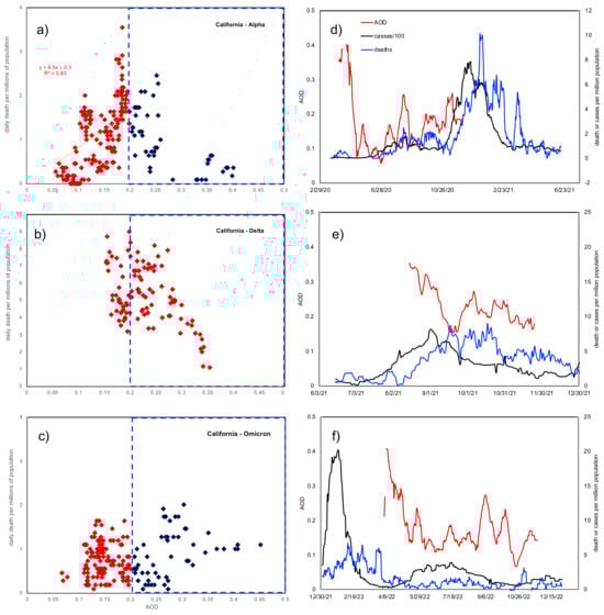 Correlation of COVID-19 deaths and AOD (a–c) and time series of cases and fatalities (d–f) in California. Note the different scales on the y-axis.