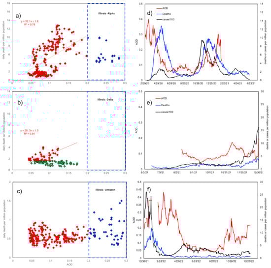 Correlation of COVID-19 deaths and AOD (a–c) and time series of cases and fatalities (d–f) in Illinois. Note the different scales on the y-axis.