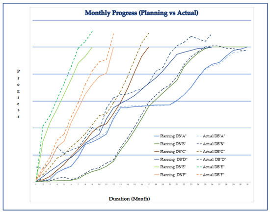 Figure 4 shows incurred losses of DB A and B of 2% and 3%, respectively. This marked a significant increase in trend compared to prior projects, some of which had experienced losses of approximately 10% due to delays. Therefore, the implementation of lean construction in projects offered long-term benefits. Basic improvements related to project communication from the initiation phase enabled the early detection of problems. Furthermore, improvements in planning and scheduling during the engineering phase led to more comprehensive project management. Compliance with government regulations, such as the ministry circulars General Infrastructure, enhanced project security for future investigations. Suppliers were invited and partnered with based upon their track records of previously conducted projects, thereby contributing to a project’s success.