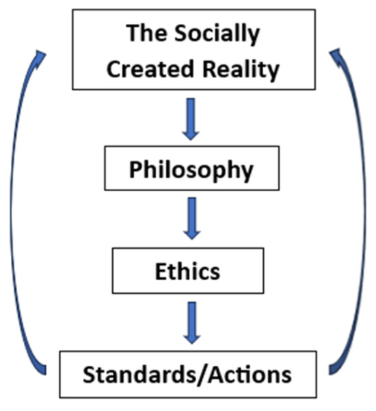 Following the philosophy, we arrive at ethics. Ethics is the point where it is necessary to make up one’s mind about philosophical assumptions and hypotheses. In other words, it is the process where it is necessary to judge what is good and what is bad, i.e., what actions do we want to promote and what actions do we want to restrain. It is, in cases like the ones discussed here, important to note that ethical issues may differ significantly from region (or country) to region or between religious beliefs. Subsequently, the possible standards/actions that will sustain the ethics should be disclosed and verified to agree with our mode of living. It is in this context worth mentioning that ethical values may vary geographically between different countries and cultures. However, it is assumed that such variations in the present case, i.e., saving the planet, are not decisive players. A decisive point is the testing and implementing of the actions to verify that it works acceptably. The model can be schematically visualized as in Figure 1 [8]. Note that the arrows leading back from the Standards/Actions to the Socially Created Reality signalize a necessary feedback to verify that the chosen Standards/Actions eventually are in agreement med the Socially Created Reality and thud, the Philosophy and the Ethics.
