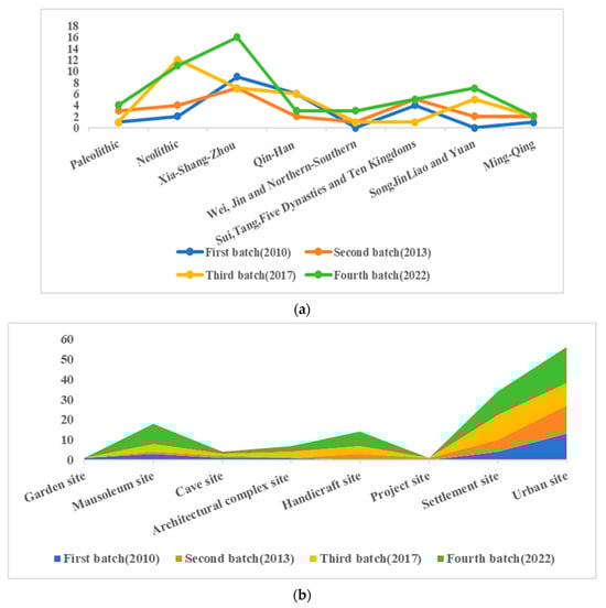 Through the analysis of the temporal changes (Figure 4a), two major characteristics were found: Firstly, the large heritage sites selected as the National Archaeological Site Parks are relatively balanced in terms of their age, and various historical periods are represented. This is due to the continuous adjustment of the selection guide. Taking the first batch of National Archaeological Site Parks as an example, most of them date back to before the Tang Dynasty. In subsequent evaluations of the National Archaeological Site Parks, the imbalanced age distribution was clearly recognized, and more sites from the Liao, Song, Jin, Yuan, Ming, and Qing dynasties were selected as potential sites. Secondly, more attention has been paid to sites spanning longer time periods, such as the original Sanxingdui site in Sichuan, the Jingdezhen Imperial Kiln, the Jizhou Kiln, and other sites spanning multiple eras.