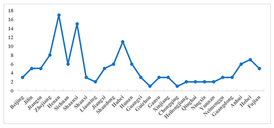 There are National Archaeological Site Parks distributed across 27 provincial-level administrative regions in China (including the 34 regions in total), accounting for about 79.41% of all of the provinces. Among them, Henan, Shaanxi, Hubei, Zhejiang, and Hebei have 17, 15, 11, 8, and 7 National Archaeological Site Parks, respectively; Sichuan, Hunan, Shandong, and Anhui each have 6 parks; Jilin, Jiangsu, Jiangxi, and Fujian each have 5 parks; and the remaining regions each have less than 5 parks (Figure 5). It can be seen from these findings that the core concentration area of the National Archeological Site Parks follows the spatial layout of the two core areas of Chinese civilization in the middle and lower reaches of the Yellow River and the middle and lower reaches of the Yangtze River. Henan and Shaanxi are attributed as the birthplaces of Chinese civilization and the Chinese nation. With their rich historical and cultural heritage and many historical relics, these two provinces have the largest number of National Archaeological Site Parks.