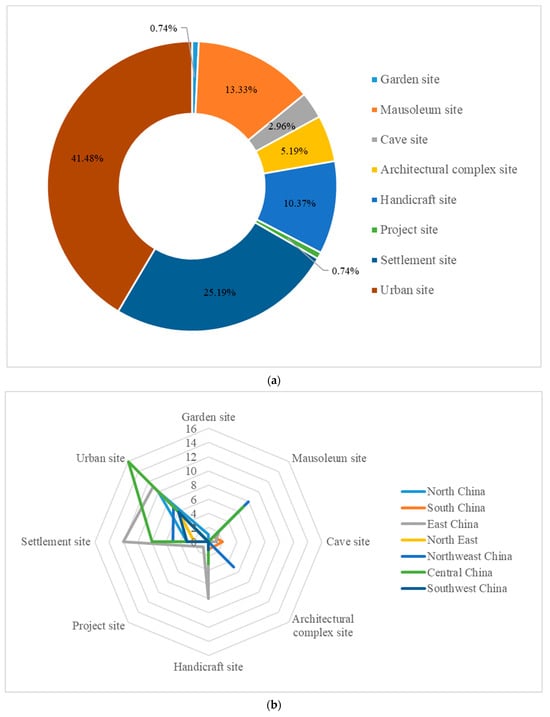 Encompassing a variety of large heritage site entities, National Archaeological Site Parks are established based on the information regarding the development of such sites officially released by the State Administration of Cultural Heritage of China on 18 April 2022 at the International Day of Monuments and Sites event [36]. As shown in Figure 6a, urban sites, settlement sites, and mausoleum sites account for 41.48%, 25.19%, and 13.33% of all National Archaeological Site Parks, respectively, and other types account for relatively small proportions. Figure 6b shows the distribution of National Archaeological Site Parks in various regions. (1) There is a wide variety of site types distributed in Central China, mainly including urban sites, mausoleum sites, and settlement sites. Sites in this area mostly reflect China’s historical evolution, changes to the social system, and economic and cultural development. (2) East China is the epicenter of traditional Chinese crafts and the main area of the circulating commodity economy in Chinese history, and as such, it contains many handicraft sites. (3) Complex architectural sites are mostly distributed in the northwest region, including palaces from ancient dynasties, temple sites, and Buddhist temple sites. (4) The types of sites distributed in North China include urban sites, garden sites, and engineering sites. Generally speaking, China’s National Archaeological Site Parks are mainly concentrated in East China, Central China, and North China, while the northeast, south, and southwest regions have fewer sites with a smaller variety of types.
