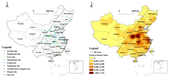 Analyzing the spatial distribution characteristics of the National Archaeological Site Parks in Figure 7, it can be seen that most National Archaeological Site Parks are distributed in East and Central China, forming a spatial distribution pattern that is dense in the east and sparse in the west, which is basically consistent with China’s “Hu Line” (Heihe City, Heilongjiang province, China (127.528° E, 50.245° N) to Tengchong City, Yunnan province (98.490° E, 25.020° N)) [45]. The nearest-neighbor indicator was used to determine the type of spatial distribution of the National Archaeological Site Parks, and the average nearest-neighbor distance of the National Archaeological Site Parks is 98.96 km, as calculated using ArcGIS10.8; when this is compared with the theoretical nearest-neighbor distance of 168.55 km, the nearest-neighbor indicator is 0.59 < 1, indicating that the National Archaeological Site Parks have a clustered spatial distribution trend.